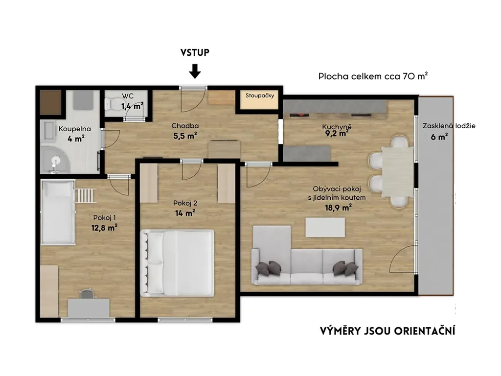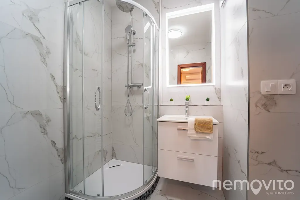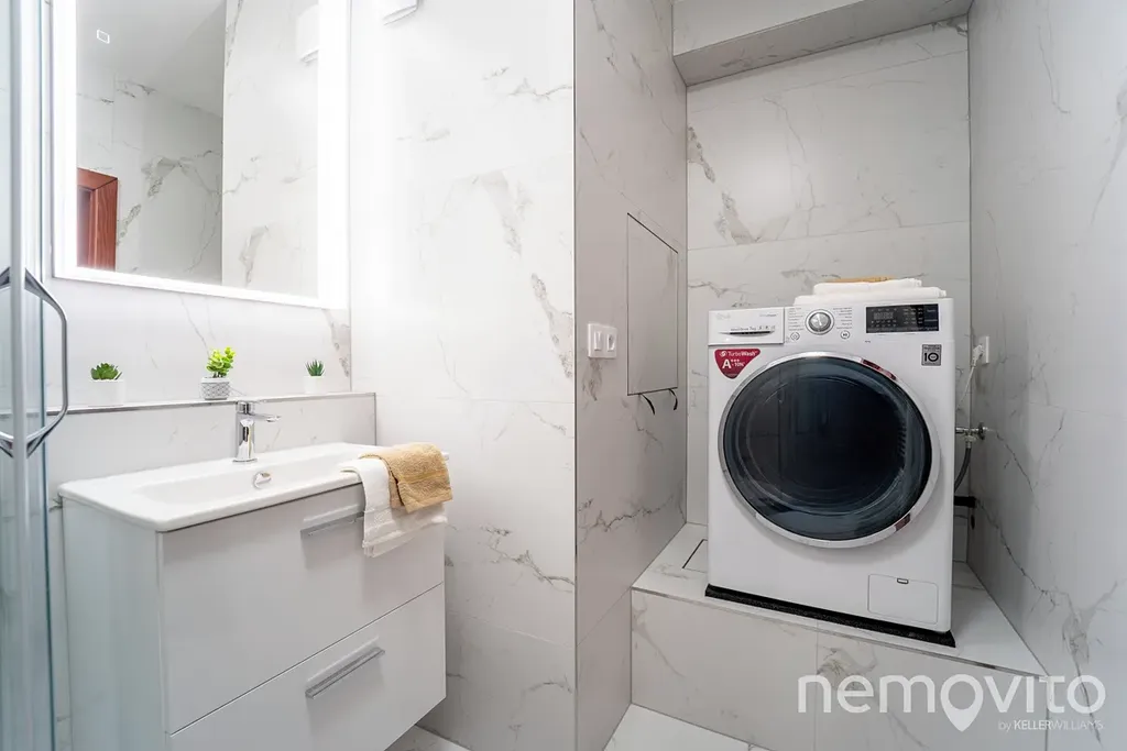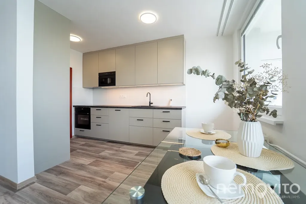 Dominantou bytu je nová kuchyňská linka na míru s vestavnými spotřebiči, která je součástí prostorného obývacího pokoje s jídelním koutem. Dispozice dále nabízí dva samostatné neprůchozí pokoje, koupelnu se sprchovým koutem a samostatné WC. Kuchyňská linka obsahuje vysokou potravinovou skříň a je vybavena vestavnými spotřebiči jako je myčka, indukční varná deska, el. trouba, digestoř, mikrovlnná trouba a lednicí s mrazákem.