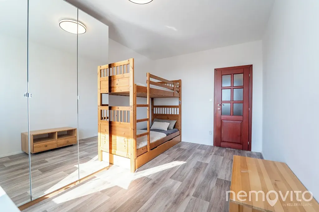 Byt se pronajímá částečně vybavený: jídelní stůl, rohová sedací souprava, konferenční stolek, patrová postel, 3× skříň, TV stolek, psací stůl, pračka a sušička.