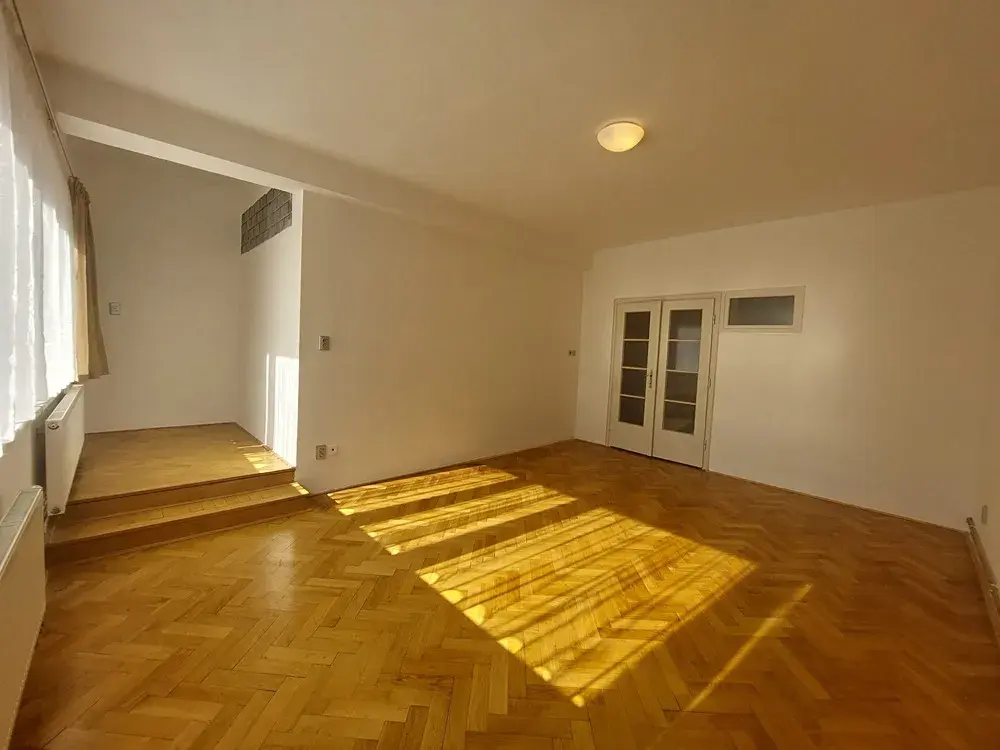 Dispozice: kuchyně o ploše 10 m² se vstupem na balkon orientovaný do zahrady, obývací pokoj s pracovním koutem 25 m², ložnice 20 m², velká předsíň 10 m² se vstupem do koupelny se sprchovým koutem, samostatné WC, šatna. V pokojích jsou na podlahách zrenovované dřevěné parkety, k dispozici úložné prostory v přízemí domu, parkování na ulici před domem.