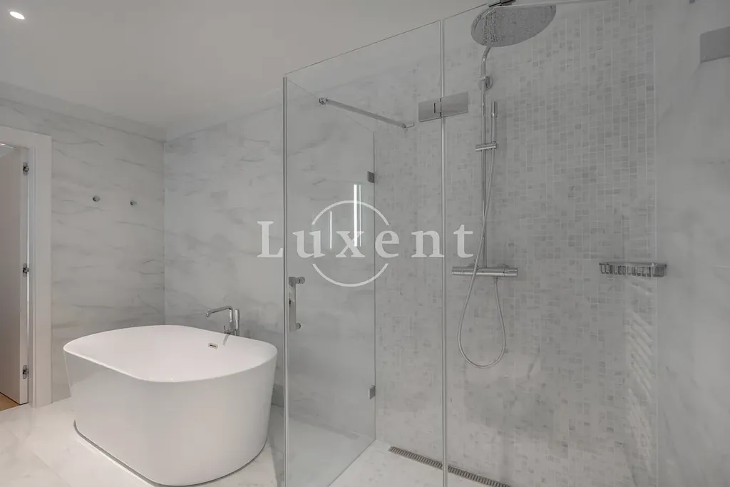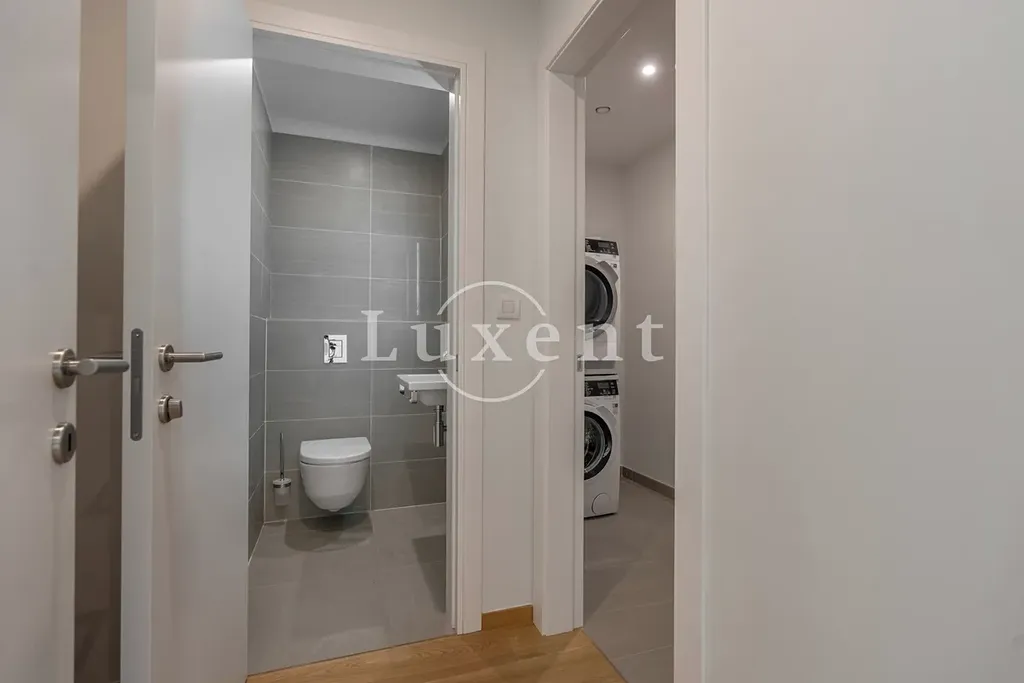 Dispozice zahrnují prostornou a světlou obývací místnost, moderní kuchyňský kout nadstandardně vybavený všemi spotřebiči, tři ložnice, jednu s vlastní koupelnou, druhou koupelnu s vanou, sprchovým koutem, toaletou a bidetem, předsíň, oddělenou technickou místnost s pračkou a sušičkou a samostatnou toaletu pro hosty.