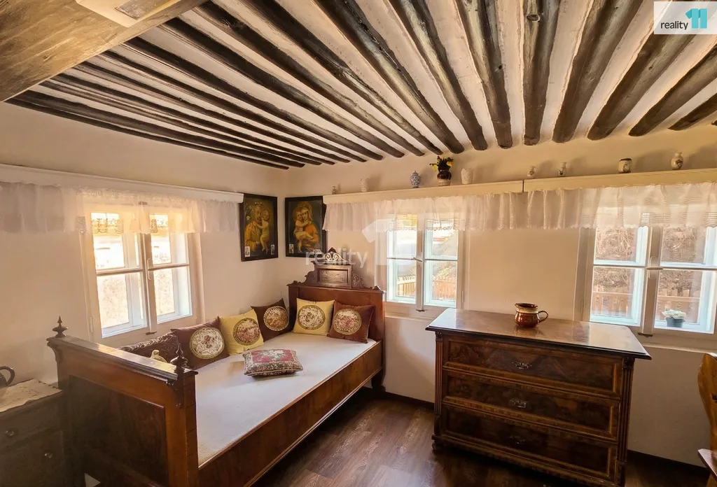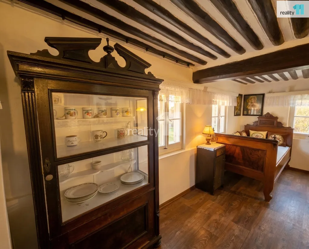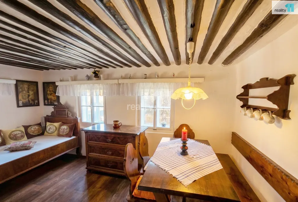 Dům se pyšní zachovaným původním rázem – dřevěné trámové stropy, palubkové obložení a historický nábytek tvoří nefalšovanou venkovskou atmosféru.