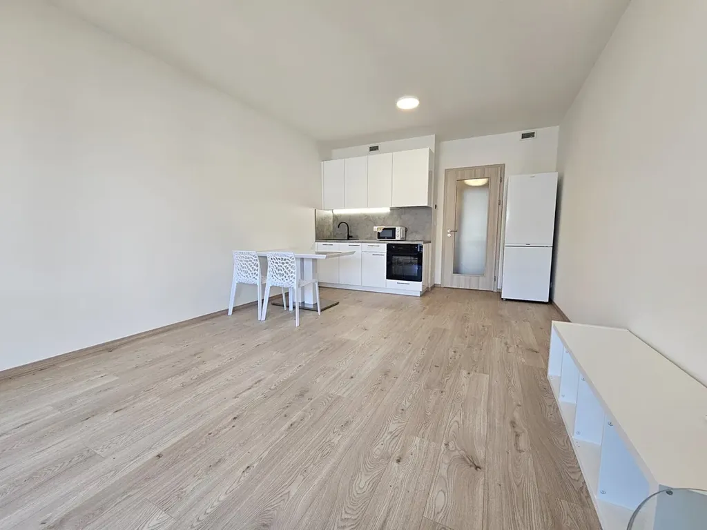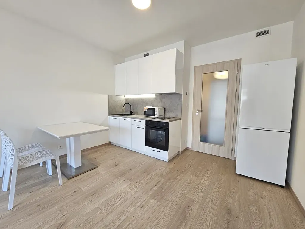 Byt je zařízen novou kuchyňskou linkou se spotřebiči (lednice s mrazákem, trouba, sklokeramická varná deska, digestoř), jídelní stůl se židlemi, televize Panasonic (bude dodána) a po dohodě je možné dodat i postel.