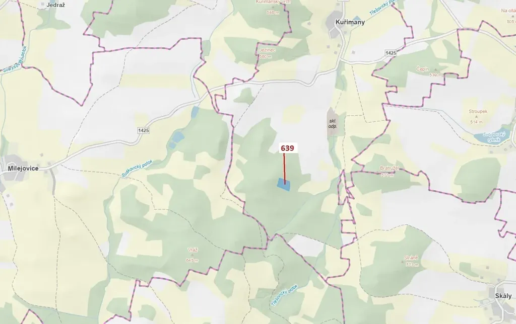 Lesní pozemek o výměře 8912 m2, parcelní číslo 639, podíl 1/1, katastrální území Kuřimany, obec Kuřimany, obec s rozšířenou působností Strakonice, okres Strakonice, Jihočeský kraj. Po těžbě.