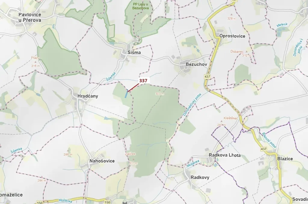 Lesní pozemek o výměře 5 963 m2, parcelní číslo 337, podíl 1/1, katastrální území Hradčany na Moravě, obec Hradčany, obec s rozšířenou působností Přerov, okres Přerov, Olomoucký kraj. Po těžbě.