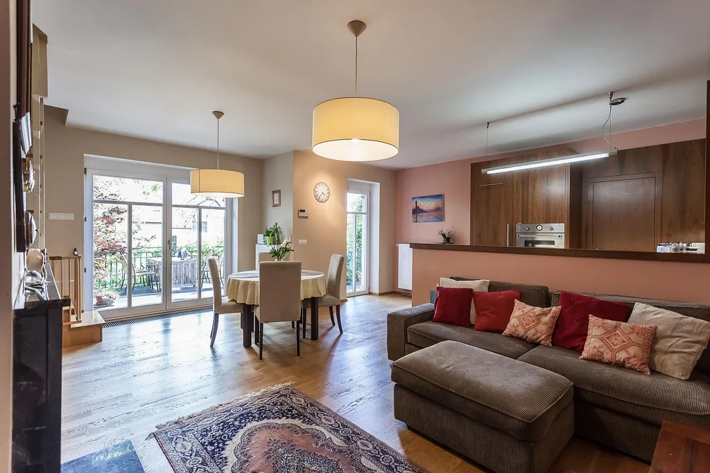 Dům s malou zahradou a terasou porostlou břečťanem s výhledem do zeleného svažitého dvora. Dům z roku 2001, který prošel v roce 2010 rekonstrukcí, nabízí díky své příznivé jihovýchodní orientaci dostatek příjemného přirozeného světla.
