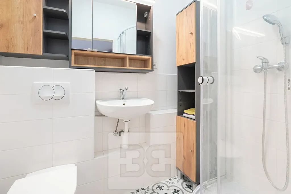 Byt je částečně vybavený a tvoří jej obývací pokoj spojený s kuchyňským koutem, vybaveným kuchyňskou linkou se spotřebiči (trouba, lednice, mrazák, pračka, varná deska, mikrovlná trouba). V obývací části je k dispozici jídelní stůl se židlemi.