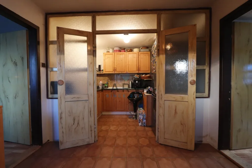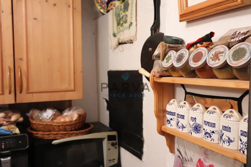 V domě se nachází předsíň , menší kuchyň s kuchyňskou linkou do tvaru L s imitací dřeva , sporákem a s funkční pecí. V kuchyni teče pouze studená voda.