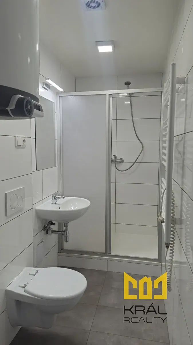 Koupelna se sprchovým koutem, WC, žebřinové topné těleso, umyvadlo, zabudované zrcadlo, elektrický boiler.
