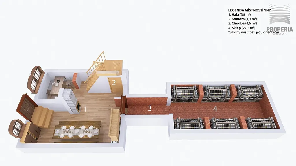 Vybavení: Vinný sklep, společenská místnost s krbem, kuchyňský kout a zastřešená terasa.