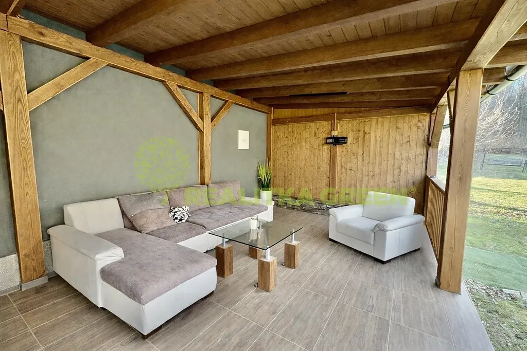 K pronajaté části domu náleží pergola s vířivkou, gaučem a stojanem na TV, zahrada a parkovací stání. Vytápění lokální na tuhá paliva, dřevo na topení zajištěno po celý rok majitelem, vlastní studna s vodou.