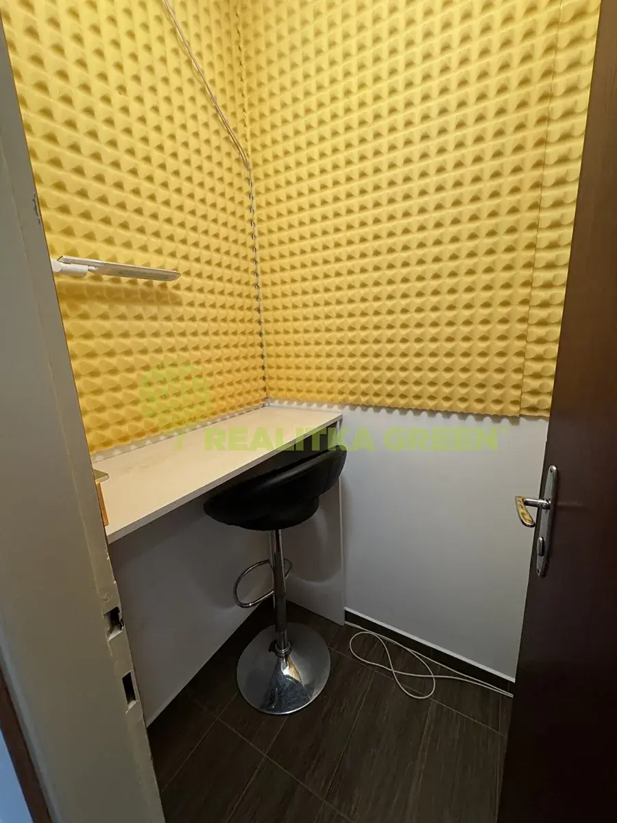 Promyšlená dispozice nabízí prostornou vstupní chodbu, čtyři samostatné kanceláře (jedna z nich se vstupem na balkon), dále kuchyň s jídelním koutem vybavenou moderní kuchyňskou linkou včetně vestavěné myčky, mikrovlnné trouby, plynového sporáku a trouby. K dispozici je také komfortní koupelna s vanou, sprchovým koutem a umyvadlem a samostatné WC.