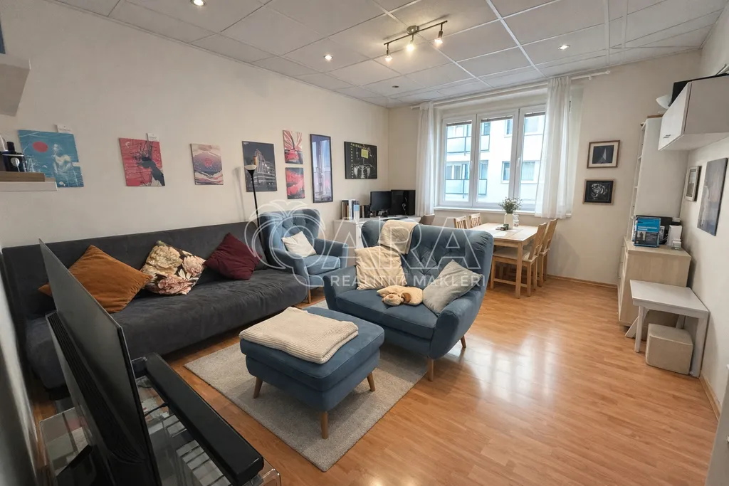 Dispozice: vstupní chodba s menším kuchyňským koutem, prostorný obývací pokoj s jídelní částí, ložnice, menší komora, koupelna s vanou a WC, součástí nájmu je také sklepní kóje.