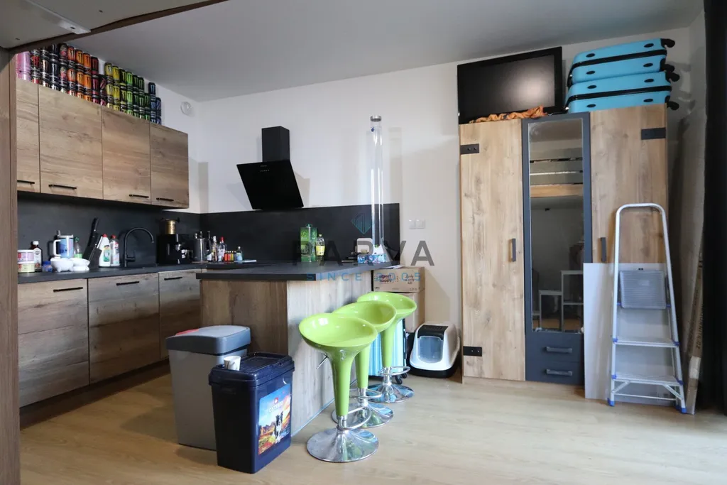V bytě se nachází menší chodba . Po pravé straně je zděné sociální zařízení - umyvadlo, sprchový kout a WC dále prostor na pračku a sušičku. V pokoji se nachází po levé straně kuchyňský kout s novou moderní kuchyňskou linkou do tvaru U s imitací lamina. V lince jsou vestavěné spotřebiče - elektrická trouba, mikrovlnná trouba, myčka , sklokeramická deska a digestoř ( součást prodeje ) . Po pravé straně vyvýšená postel - palanda . Pod dvoulůžkovou postelí se nachází sedací souprava a po levé straně obývací stěna se skříní. Dominantou bytu - pokoje - jsou francouzské dveře vedoucí na terasu k relaxaci ale i k pěstovaní květin či zeleniny.