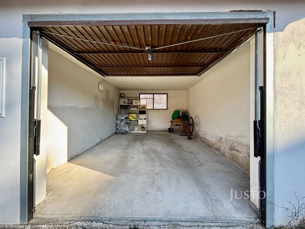 Garáž disponuje připojením na elektřinu (230V, 380V). Pro vjezd od garáže jsou k dispozici sklopné vrata Hörmann.