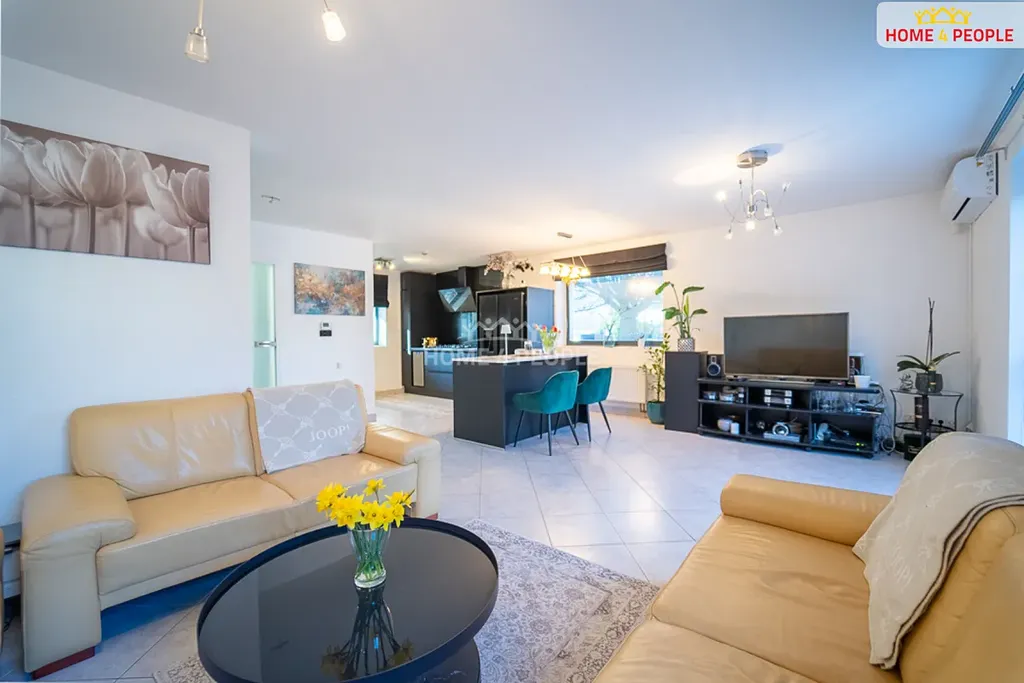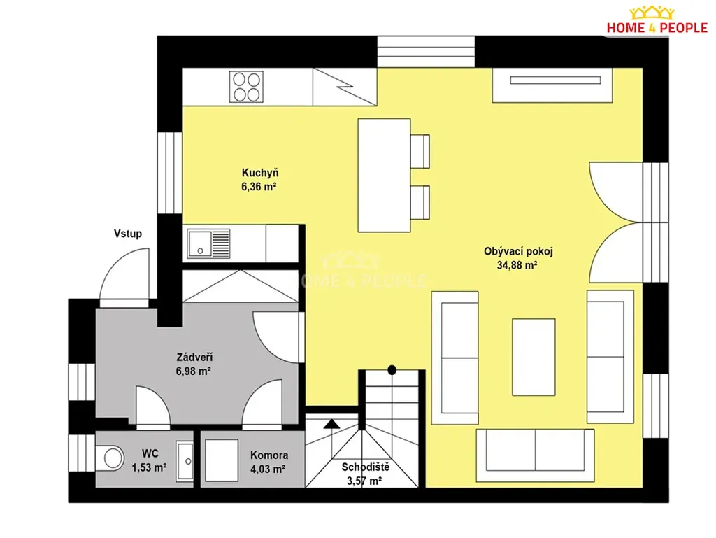 V přízemí je chodba, kde je samostatné WC a technická místnost se sprchovým koutem. Dále jsou zde vestavěné skříně. Obývací pokoj (36,50 m²) s kuchyní a jídelním ostrůvkem (6,76 m²) s technistonem z roku 2025 tvoří hlavní místnost domu. Kuchyně je zařízená kombinovanou troubou s mikrovlnkou značky Gorenje, plynovým sporákem Bosch, ledničkou Gorenje a vestavěnou vinotékou Philco. Na podlaze je dlažba s vytápěním.
