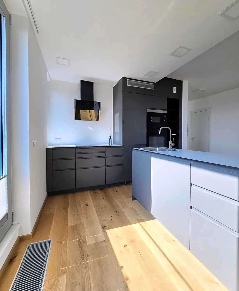 (Cena včetně vybavení ( kuchyňská linka s vestavěnými spotřebiči AEG ). Parkovací stání a sklep 800.000 Kč)