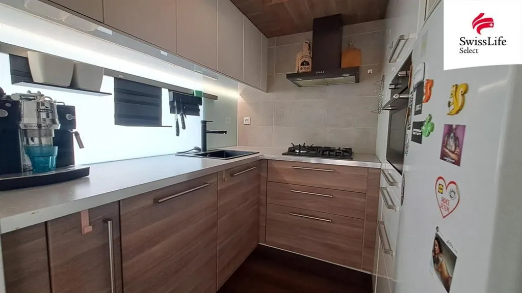 Prostor pro příjemné bydlení o rozloze 41 m2 je upravený na 2 + 1, když šikovnou realizací vznikly dva samostatné pokoje - každý se zvláštním vchodem z předsíně: obývák a ložnice. Naproti obýváku našla své místo menší kuchyně ve tvaru do U, kde můžete kulinařit, aniž byste kohokoliv rušili. Je vybavená varnou deskou s plynovými hořáky, samostatnou elektrickou troubou, starší lednicí a mnoha skříňkami pro uložení potřebného nádobí.