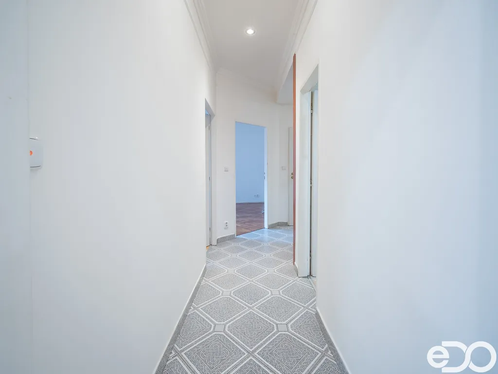 Obývací pokoj působí vzdušně a příjemně díky velkým oknům, která přivádějí dostatek denního světla po celý den. Zachovalé parkety v klasickém vzoru dodávají interiéru přirozené teplo a charakter. Ložnice je samostatná a klidná, což poskytuje dostatek soukromí pro spánek i odpočinek.