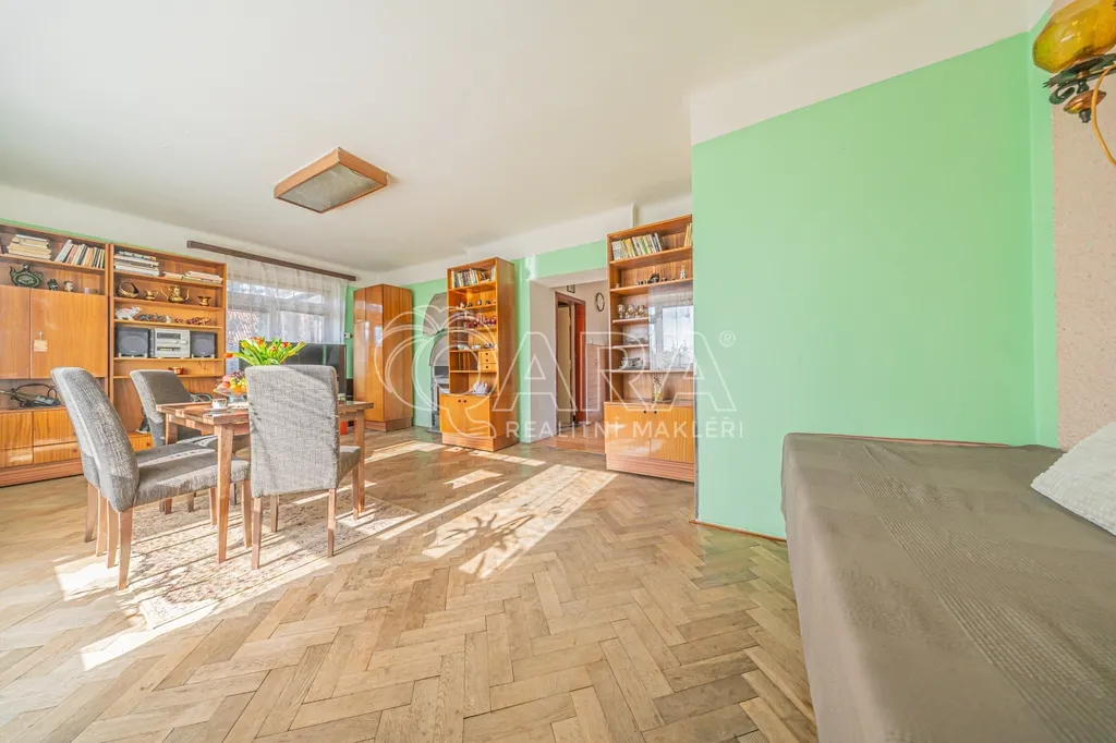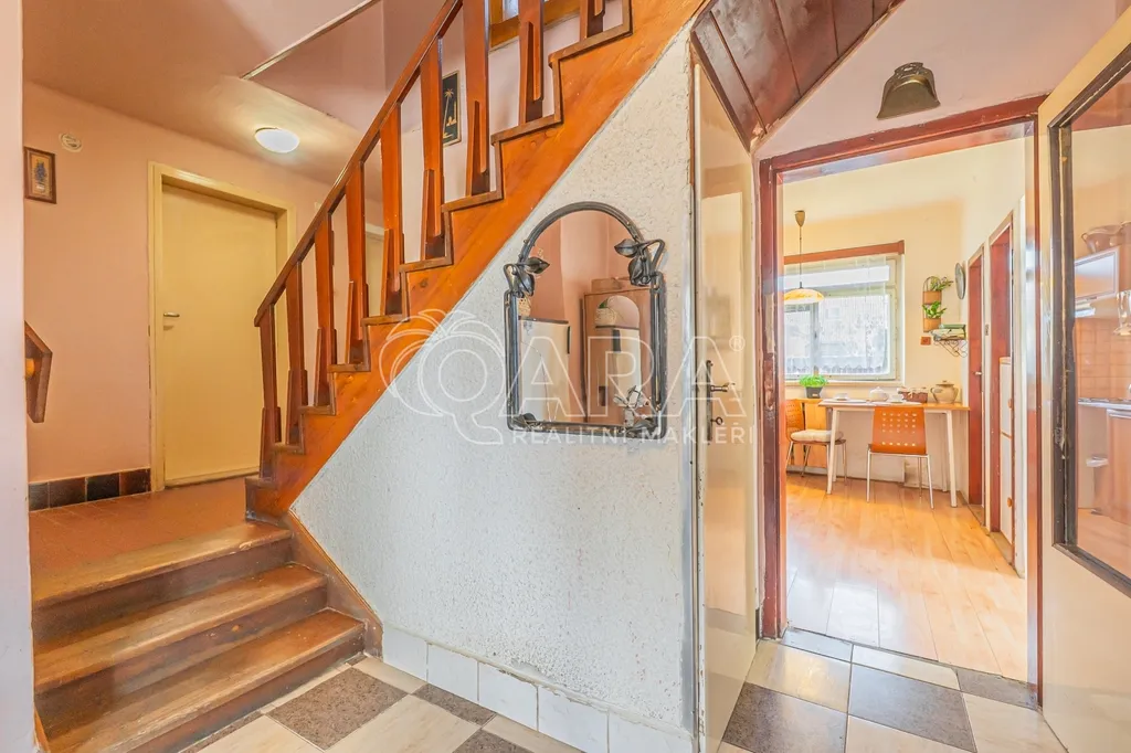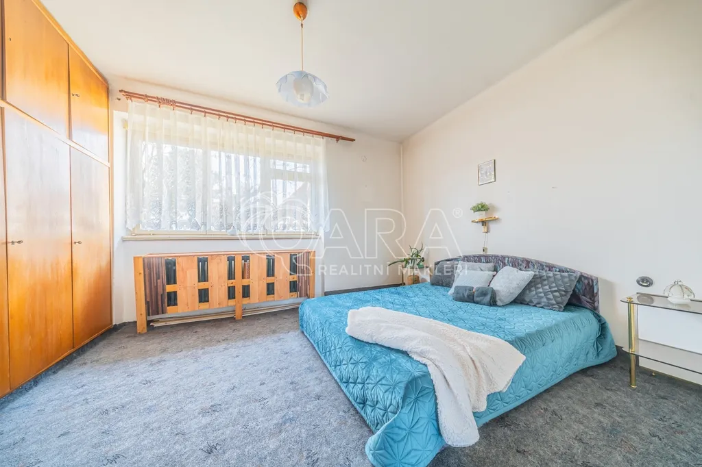 Klidová část domu v přízemí je oddělena dvěma schůdky v hlavní chodbě. Nachází se zde samostatné WC a dvě ložnice se samostatnými vstupy, které jsou však pro větší variabilitu i vzájemně průchozí. Naproti toaletě najdete koupelnu s vanou a vedle ní původní vestavnou skříň poskytující dostatek úložného prostoru.