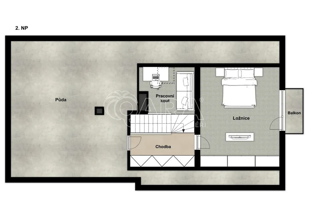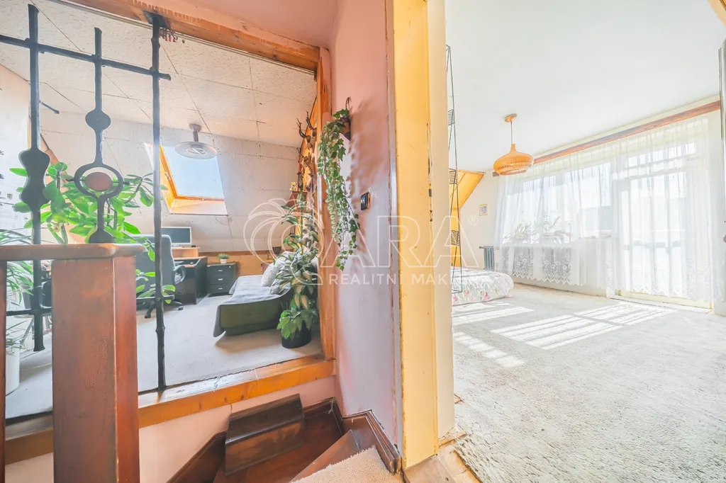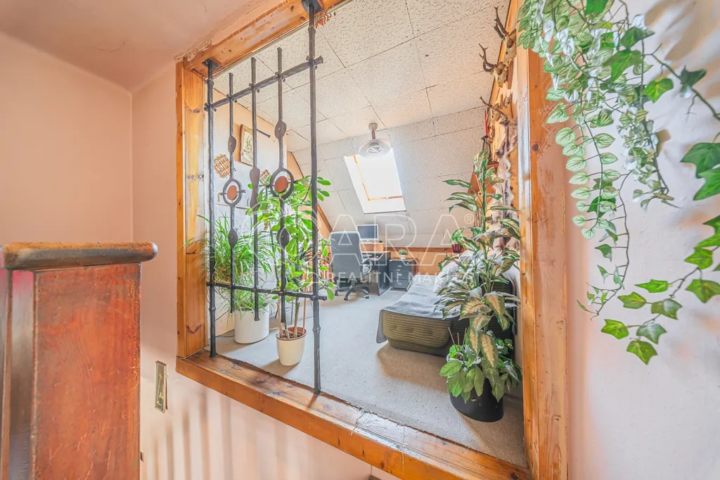 Po dřevěných schodech vystoupáte do patra, kde na vás čeká další ložnice se vstupem na balkon a otevřený prostor využívaný jako pracovní kout. Dalším benefitem je prostorná půda, která nabízí nejen další úložné místo, ale především potenciál pro vybudování dalších pokojů či zcela samostatné bytové jednotky.