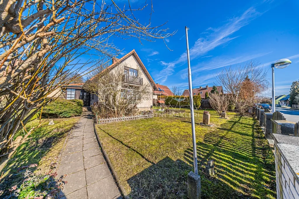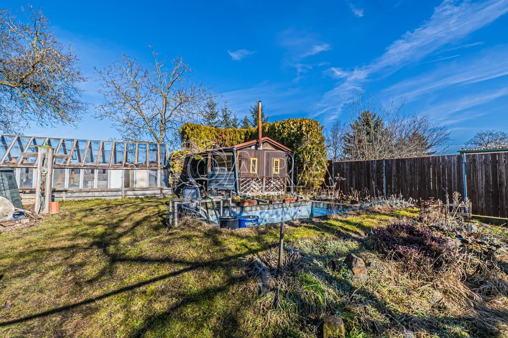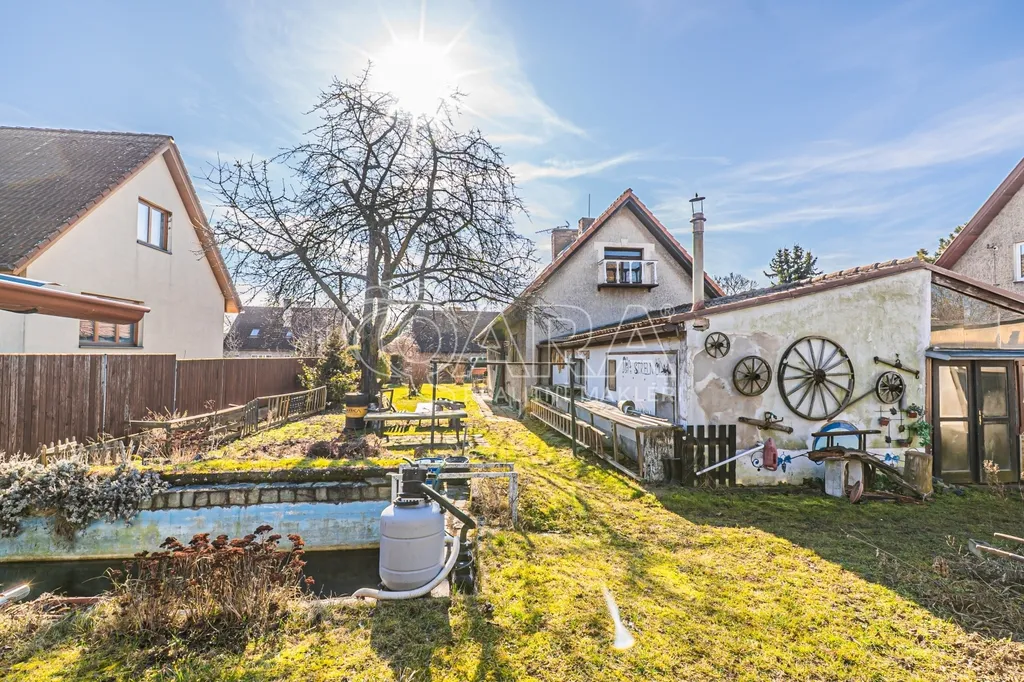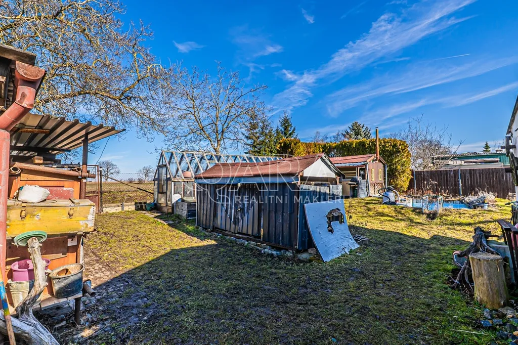 Venkovní zázemí domu doplňují funkční kolny, garáž a zastřešené prostory za domem, které lze nadále využívat nebo je odstranit a otevřít tak zahradu pro další využití podle vlastních představ.