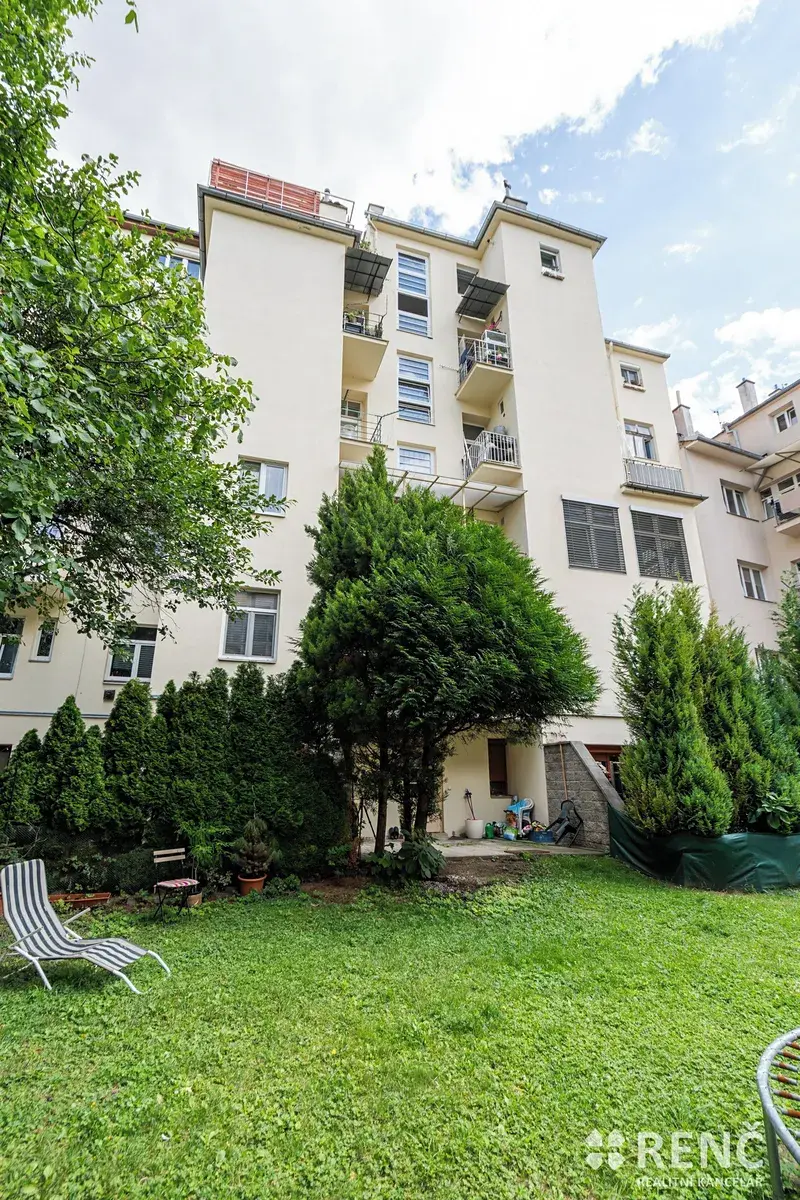 K prodeji nabízíme prostorný světlý byt o dispozici 4+kk s terasou, který se nachází ve 4. patře (5. NP) zděného bytového domu na ul. Erbenova na úpatí čtvrti Černá Pole. Součástí bytu je velká vstupní předsíň se šatní skříní, hlavní obytný prostor s kuchyní, jídelnou a vstupem na terasu, vše orientováno do vnitrobloku. Byt má rovněž tři samostatné ložnice a šatnu, koupelnu s velkým oknem a vanou a samostatné WC. Celková podlahová plocha bytu je 102 m2, terasa navazující na obývací pokoj má dalších 19 m2. Plocha hlavního obytného prostoru je 42 m2, předsíň má výměru 4,2 m2, koupelna 6 m2, šatna 4 m2 a tři ložnice se střešními okny a zkosenými stropy mají výměry 18 m2, 13 m2 a 12 m2. Byt je orientován jihovýchodním a severozápadním směrem a je díky své poloze velmi dobře osvětlen. Za domem ve vnitrobloku je uzavřená společná zahrada, kterou lze využívat k odpočinku a posezení. V přízemí domu je menší místnost pro uložení kol a kočárků. K bytu lze koupit rovněž garáž v domě a využívat tak i další stání před garáží. Byt byl postaven a kolaudován v roce 2008 jako půdní vestavba ve střeše funkcionalistického bytového domu z roku 1934. Byt je vybaven kuchyňskou linkou včetně sklokeramické varné desky, elektrické trouby a myčky. V hlavním obytném prostoru je klimatizační jednotka. Vytápění bytu a ohřev vody zajištuje vlastní plynový kotel umístěný v koupelně. Bytová jednotka má z části dřevěná eurookna včetně předokenních rolet, z části střešní okna Fakro včetně venkovních clon. Střecha nad bytem má keramickou a plechovou krytinu, krov je dřevěný, veškeré hlavní konstrukce jsou z roku 2008. Vnitřní stěny bytu jsou z části zděné a z části sádrokartonové. Podlaha v obývacím pokoji dřevěná, v ložnicích lamino, keramická dlažba v předsíni, koupelně a na WC. V září 2025 proběhla generální oprava terasy včetně nové hydroizolace, nášlapná vrstva je nově z odolného cedrového dřeva. Měsíční zálohové platby za služby spojené s užíváním bytu (voda, fond oprav, společné výdaje domu) činí 2.987 Kč. Nad rámec této platby je hrazena spotřeba plynu pro ohřev vody a vytápění bytu ve výši 2.000 Kč a spotřeba elektřiny ve výši 1.300 Kč, celkem tedy činí měsíční náklady za užívání bytu 6.300 Kč. K bytu nabízíme ke koupi i garáž jako samostatná jednotka za cenu 2.000.000 Kč, která je umístěná v domě, díky nájezdu před garáží je tak možné zaparkovat další automobil. V okolí domu jsou veřejná parkovací místa – modré zóny kategorie C, pro rezidenty za roční poplatek 800 Kč. Prvorepublikový bytový dům prošel opravami společných částí, včetně vstupu obloženého z části mramorem, dům má nové vstupní dveře, novou fasádu, nové vedení páteřních instalací v domě, zahrada je udržovaná, v domě funguje velmi dobře SVJ. Dům je situován na úpatí Černých Polí, cca 100 m od parku Lužánky, v okolí je veškerá občanská vybavenost, do centra města je možné dojít během 10-ti minut přes park pěšky. V případě zájmu o prohlídku nás prosím kontaktujte. Nemovitost je možné použít jako zástavu v případě financování koupě prostřednictvím úvěru.
