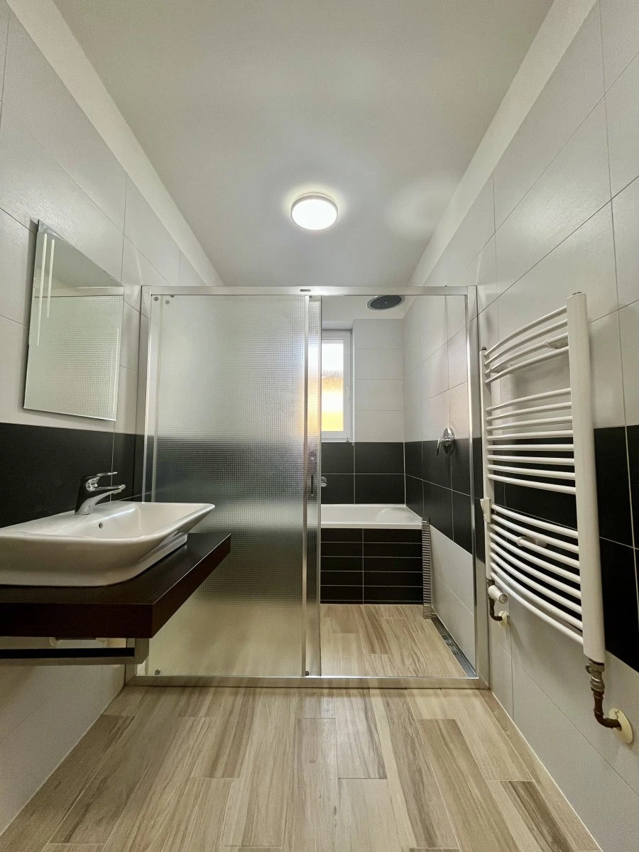 Koupelna nabízí vanu a také sprchový kout - je zde také prostor na pračku případně sušičku.