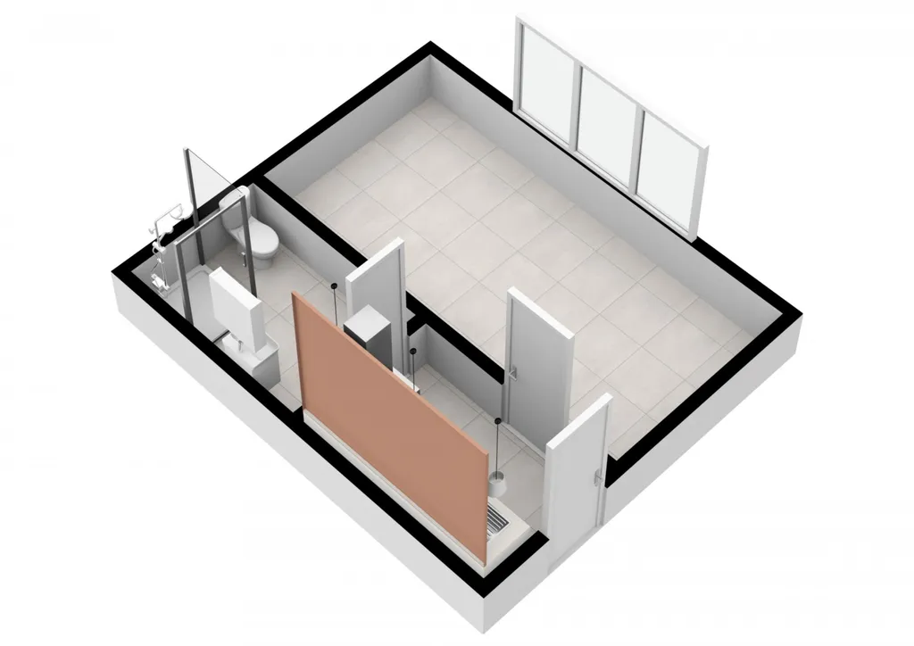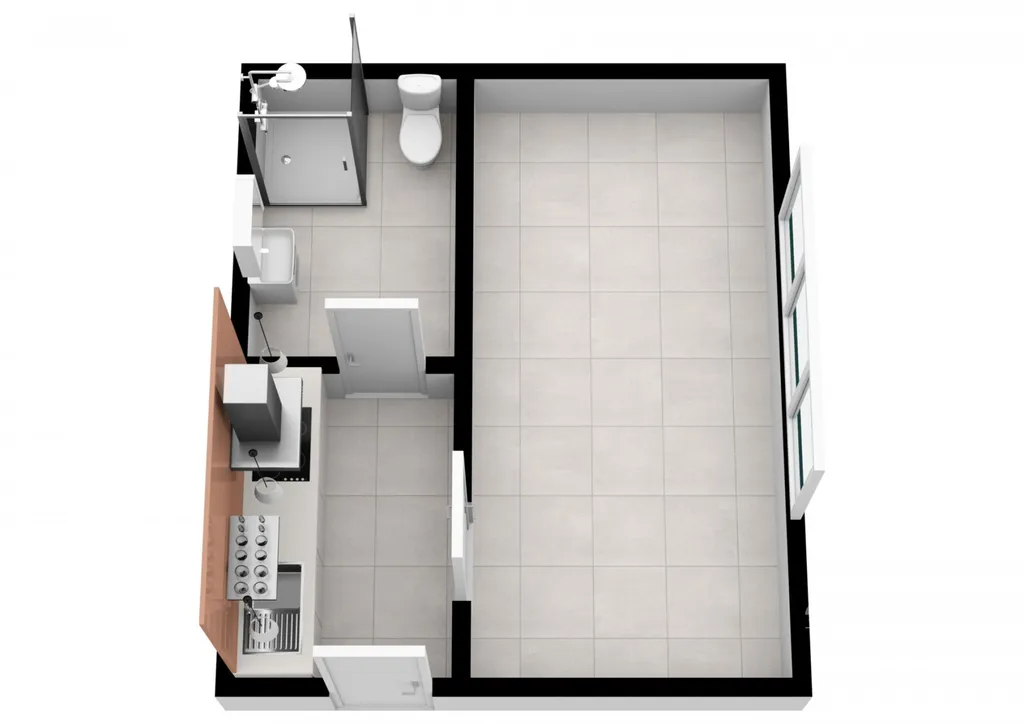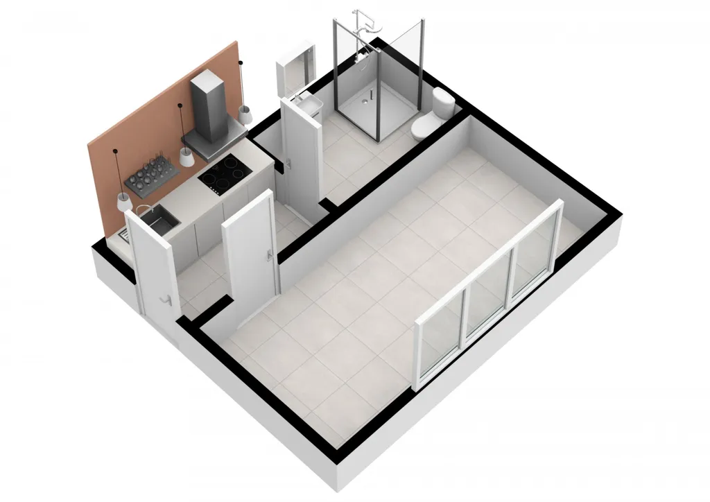 Nezařízené, jen kuchyňská linka. Koupelna se sprchovým koutem, WC v koupelně. Na podlahách položena dlažba. Topení centrální.