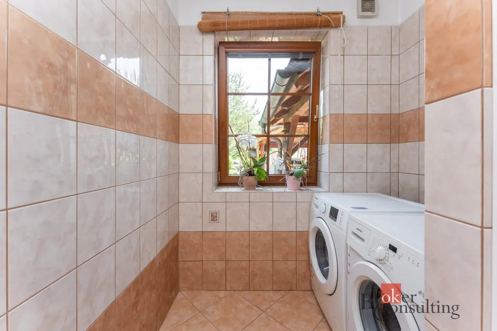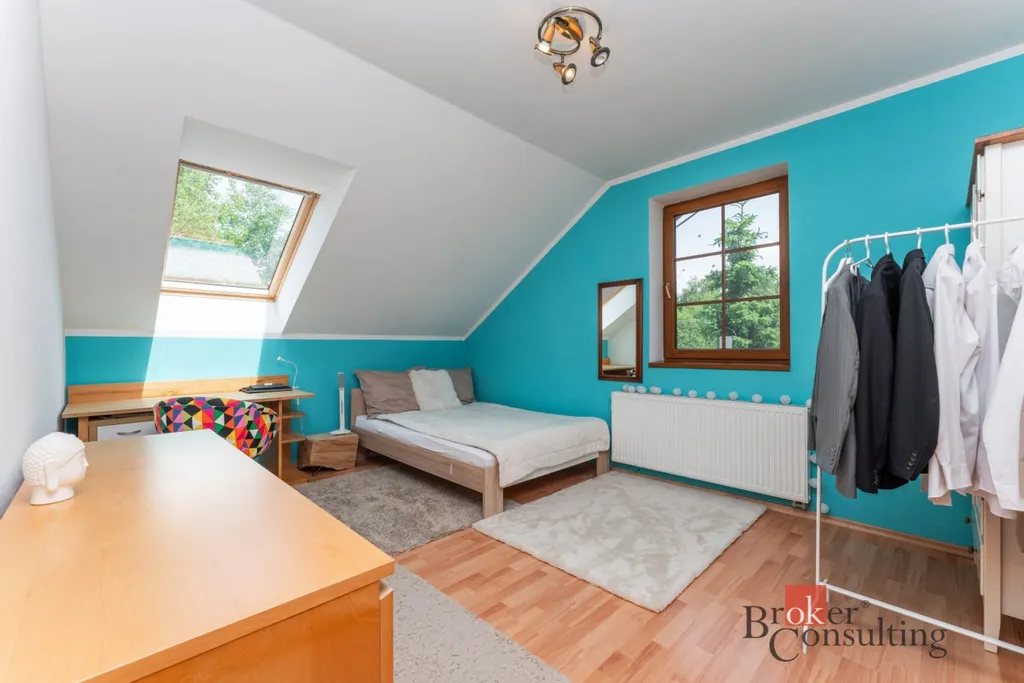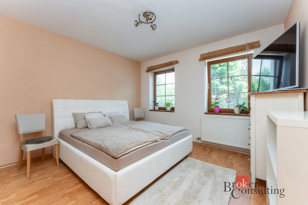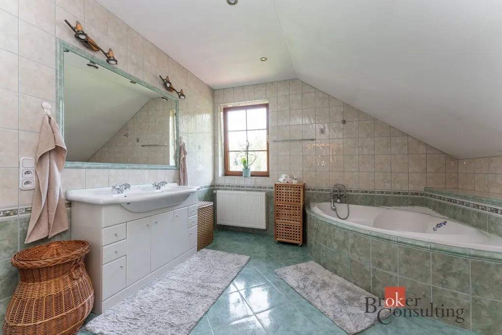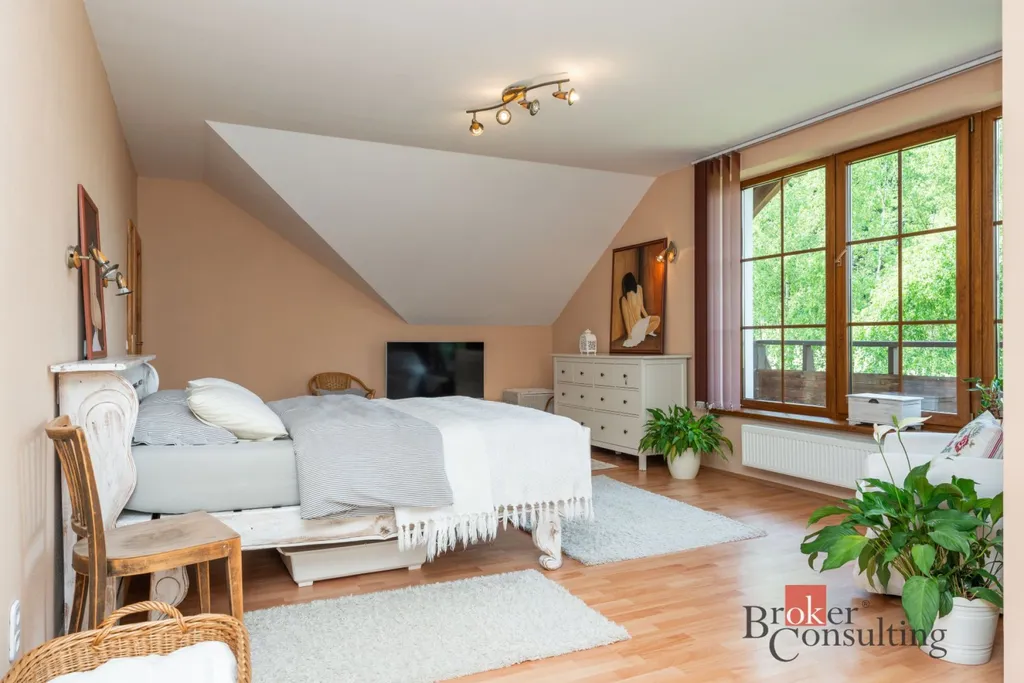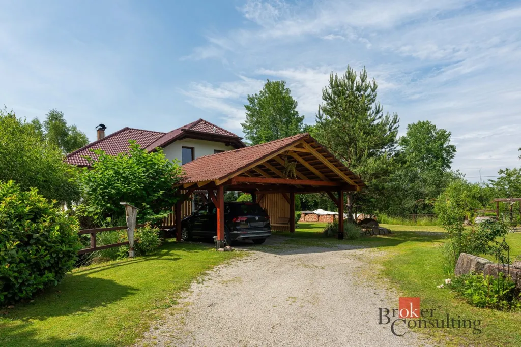 Dům obklopuje vzrostlá zeleň, která poskytuje vysokou míru soukromí. Součástí zahrady je útulná terasa s posezením a grilem, přístřešek pro parkování dvou aut a jezírko s molem.