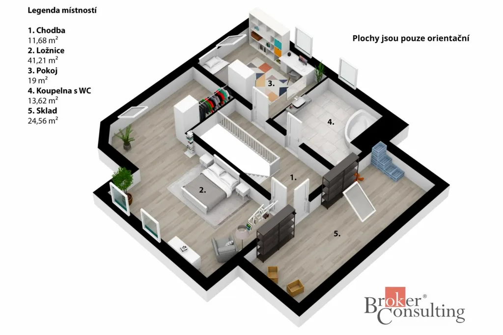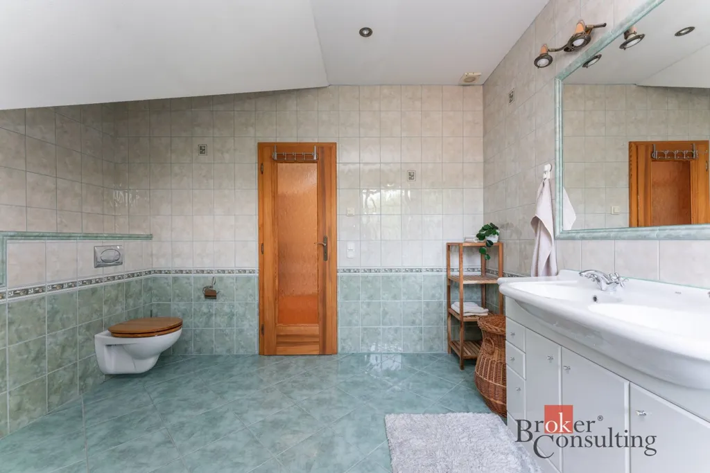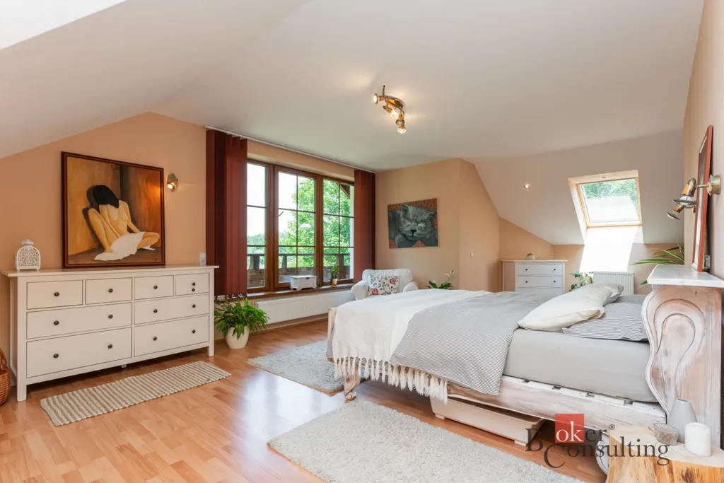 V 1. patře se dále nachází ložnice s šatnou (26,68 m² + 14,53 m²) a výhledem do zelené krajiny. Součástí 1. patra je dále chodba (11,68 m²), pokoj (24,56 m²), koupelna s toaletou (13,62 m²) a dětský pokoj (19,01 m²). Nad obytnou částí se nachází půdní prostor.
