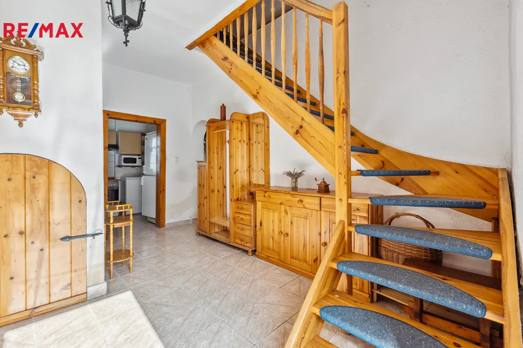 Na stodolu navazuje rodinný dům. V prvním patře se nachází dvě útulné ložnice, kuchyň, koupelna a místnost o ploše 38 m², která se perfektně hodí jako rodinná jídelna, ateliér, herna nebo třeba prostor pro podnikání. V horním patře najdete další ložnici, světlý obývací pokoj a druhou koupelnu. Dům je vytápěn plynovým kotlem, kotlem na tuhá paliva a krbem, který dodává interiéru příjemnou atmosféru.