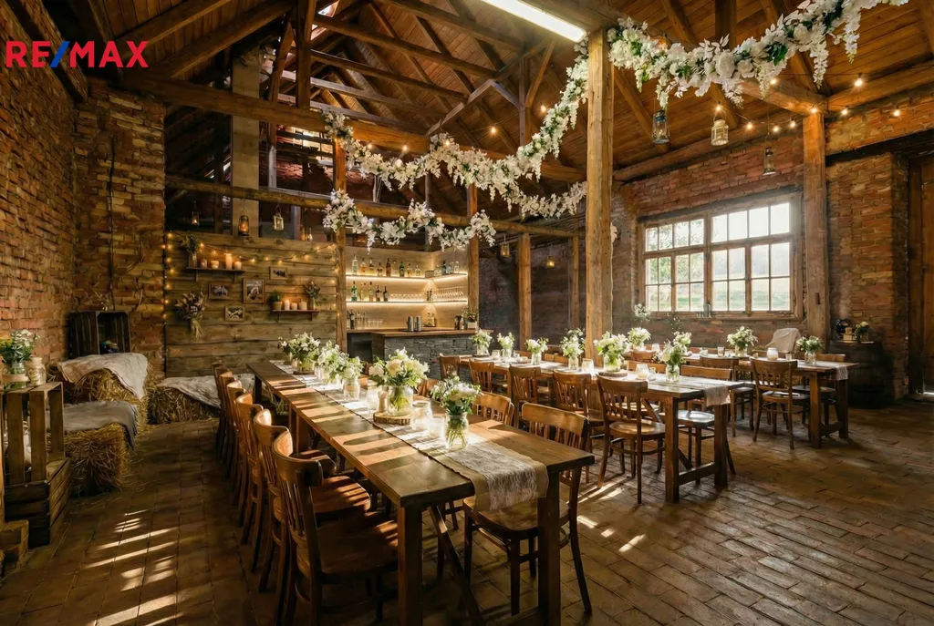 Hospodářská budova – samostatně stojící patrová stodola 178 m² - možnost přestavby na stylovou restauraci, svatební sál, ubytování nebo víceúčelovou rekreační část. Díky přiložené vizualizaci si můžete představit, jak by se dala stodola zařídit a jak by mohla vypadat. Pod stodolou se nachází prostorný sklep – ideální pro uskladnění produktů z vlastní zahrady, vína nebo kulinářských zásob. Stodola díky své velikosti, dispozici a atmosféře nabízí výjimečný potenciál pro svatby, oslavy, workshopy nebo gastronomický provoz. Přilehlá garáž/dílna.