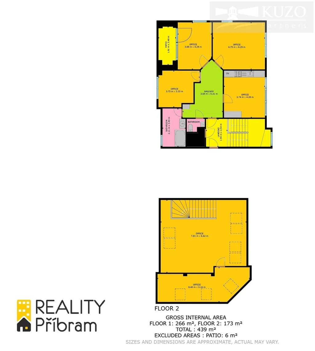 Patro: Dvě samostatné kanceláře, toalety (dámské/pánské) a kuchyňka.