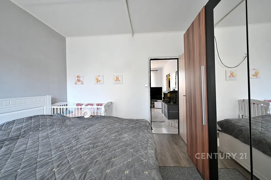 Ložnice nabízí manželskou postel o velikosti 180 × 200 cm s roštem (bez matrací) a velkou šatní skříň, která poskytne dostatek úložného prostoru. Z ložnice je vstup na zasklenou lodžii (5 m²), která nabízí příjemné místo pro ranní kávu nebo večerní odpočinek. K dispozici jsou dvě křesla, dvojkřeslo, stolek a mechanické žaluzie pro větší soukromí.