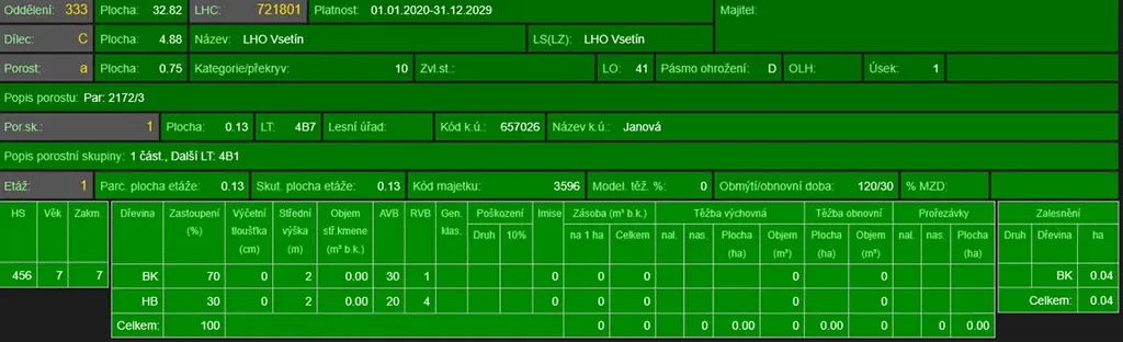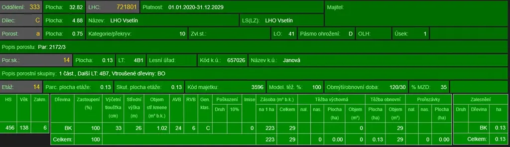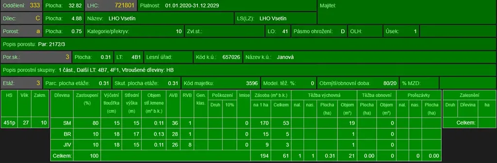 - p.č. 2172/3 vedená jako lesní pozemek o celkové výměře 7 449 m2 (stáří lesa 144 let - zastoupení dřevin buk, stáří lesa 106 let - zastoupení dřevin smrk, stáří lesa 33 let - zastoupení dřevin smrk, bříza, vrba, stáří lesa 13 let - zastoupení dřevin buk, habr).