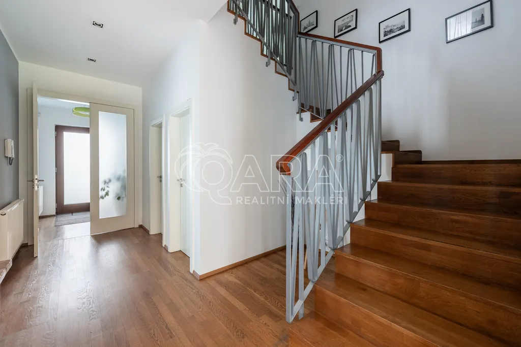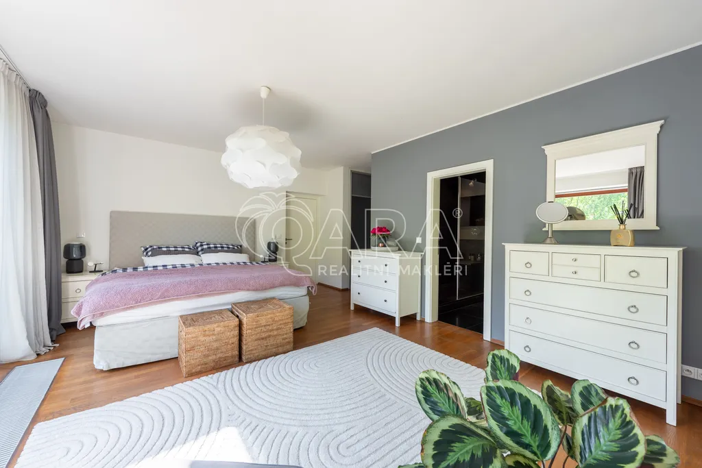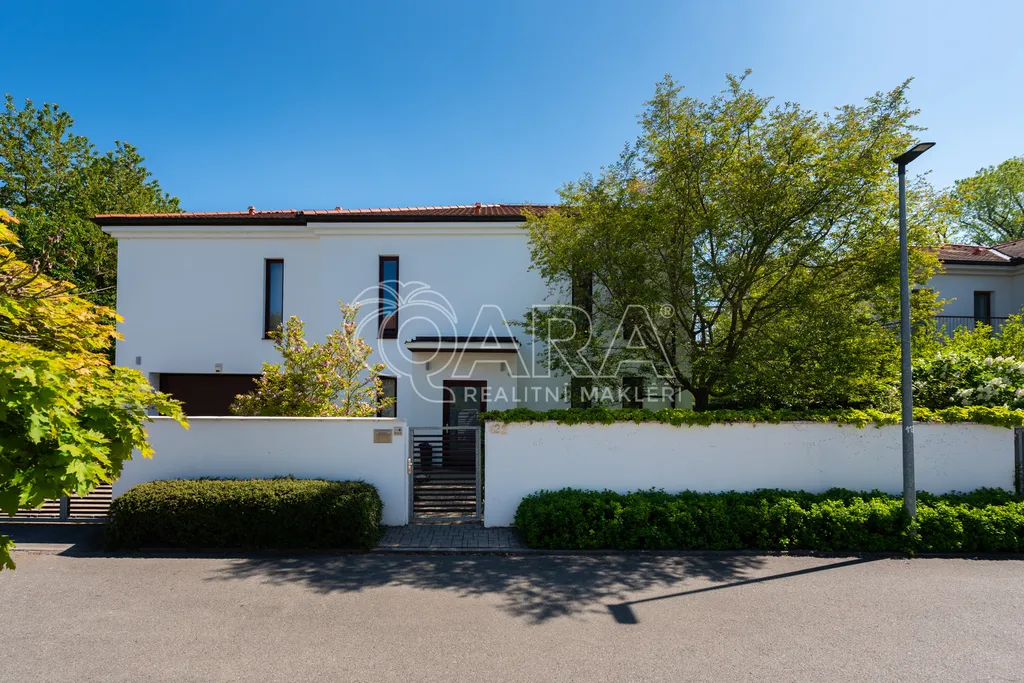 Dvoupodlažní dům s rozlohou 285 m2, který je charakteristický čistými liniemi a velkými francouzskými okny, nabízí v přízemí velkorysý obývací pokoj, prostornou jídelnu a kompletně zařízenou kuchyň s vestavěnými spotřebiči se vstupy na zahradu. V 1. patře se nachází hlavní ložnice s koupelnou a šatnou, dva dětské pokoje, jeden z nich s koupelnou, pokoj pro hosty a velká koupelna se sprchou a samostatně stojící vanou od designéra Philippa Starcka. Všechny ložnice umožňují přístup na balkón nebo terasu. Pro uložení sezónních věcí lze využít půdní prostor. V domě je kvalitní dřevěná dubová podlaha, mramorové obklady a vestavěné skříně. Součástí domu je rovněž garáž pro dva automobily, technická místnost s kuchyní a prostorem pro pračku a sušičku. Ohřev vody a vytápění jsou řešeny plynovým kotlem. Bezpečí zajišťuje kamerový systém v areálu celého projektu. Zahrada je zavlažována, pro posezení jsou položeny terasy ze tří stran domu.