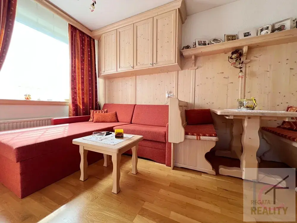 Tento plně zařízený apartmán s obytnou plochou přibližně 23 m² je malý, ale perfektně vybavený a i přes svou malou velikost nabízí promyšlený prostor. Velký a prostorný balkon o rozloze přibližně 18 m² ve tvaru L, nabízí nádherný výhled na okolní hory. Je ideální pro relaxaci, opalování nebo užívání si pohody.