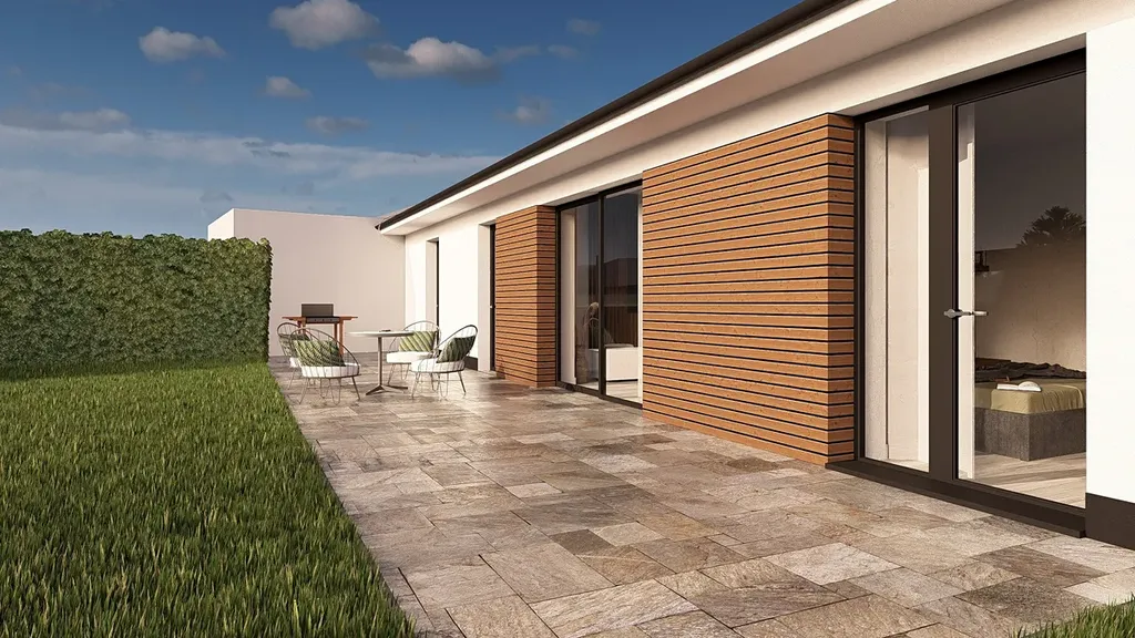 Zahrada s budoucí terasou je přístupná z garáže, z ložnice i z obývacího pokoje.