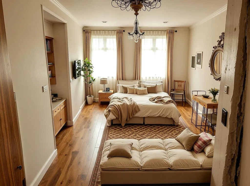 Součástí je také koupelna se sprchovým koutem a toaletou.