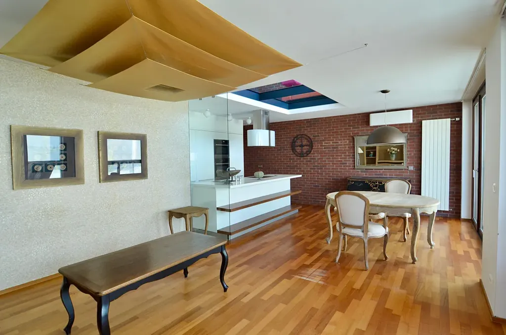 Celková užitná plocha bytu v osobním vlastnictví s dispozicí 6+KK a třemi koupelnami (na každém podlaží jedna) činí 193,84 m², z čehož čistá obytná plocha je 163,86 m². Byt disponuje shodně prostornou lodžií, umístěnou v nižším podlaží, která je uzavíratelná posuvnými skly a terasou ve vyšším podlaží. Každá z nich má výměru 14,99 m². Praktická je též prostorná šatna na podlaží u manželské ložnice.