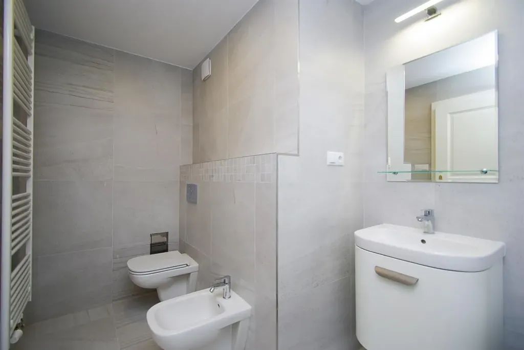 Interiér bytu je nezařízený. Dispozice ve spodním patře nabízí vstupní halu, obývací pokoj, ložnici, samostatnou kuchyni, dvě koupelny. Kuchyně je vybavena linkou s vestavěnými spotřebiči: trouba, varná deska, myčka, lednice s mrazákem. První koupelna je vybavena vanou, toaletou a bidetem, druhá je vybavena sprchovým koutem, toaletou a bidetem. Z obývacího pokoje vedou schody nahoru do horní úrovně bytu, kde se nachází podkrovní pokoj a toaleta. Byt je vybaven klimatizací.