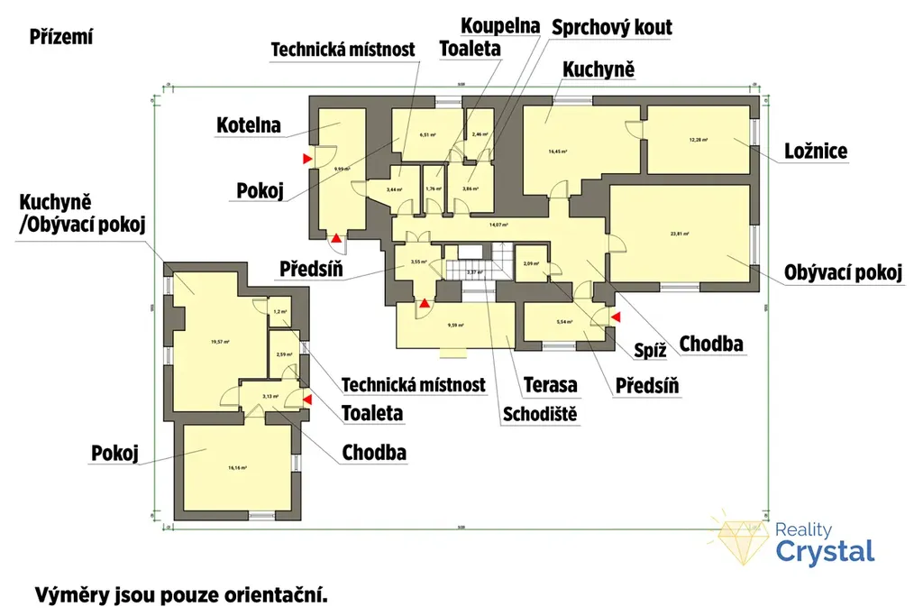 Přízemí tvoří chodba, prostorná kuchyň s jídelnou, obývací pokoj, ložnice, koupelna se sprchovým koutem, samostatné WC a technická místnost o rozloze cca 100 m2, viz. půdorys ve fotogalerii.