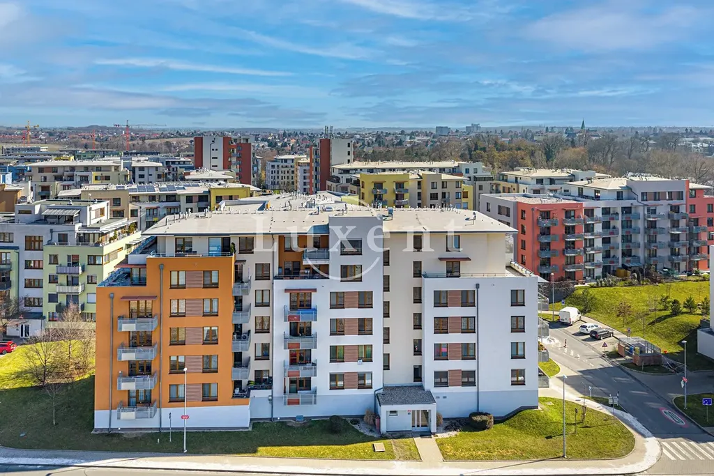 Byt se nachází v 6. nadzemním podlaží a jeho dispozice zahrnuje vstupní halu (7 m²), prostorný obývací pokoj s plně vybaveným kuchyňským koutem (31,8 m²), ložnici s vestavěnou šatní skříní (14,6 m²), praktickou komoru (2,6 m²) a koupelnu s WC (5,9 m²), která je vybavena vanou, topným tělesem a místem pro pračku. Z obývacího pokoje je vstup na velkorysou, částečně zastřešenou terasu (20 m²), která nabízí krásné výhledy do okolí. K bytu náleží také sklep a jedno garážové stání.