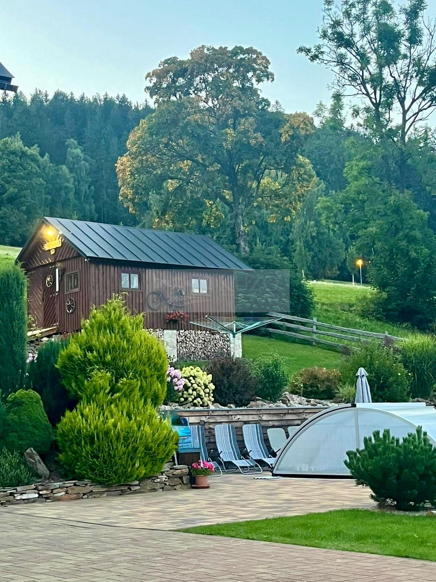 K domu náleží pozemek o celkové výměře 1 850 m², který poskytuje dostatek prostoru pro relaxaci hostů i případný další rozvoj areálu. Velkou výhodou je vlastní studna a napojení na obecní kanalizaci, což přispívá k bezproblémovému a ekonomickému provozu.