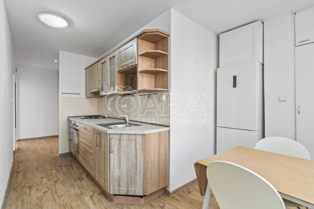 Byt o dispozici 2+1 má celkovou plochu 61 m2 a k tomu navíc prostornou lodžii (5,4 m2), kde si můžete v klidu vychutnat kávu. Nachází se ve 4. patře panelového domu s výtahem. Dispozičně je byt řešen velmi prakticky – v kuchyni najdete linku se sporákem, troubou a lednicí. V koupelně je k dispozici sprchový kout a místo na pračku. Výhodou je dostatek úložného prostoru díky vestavěným skříním v předsíni i v ložnici. K bytu náleží také sklepní kóje.