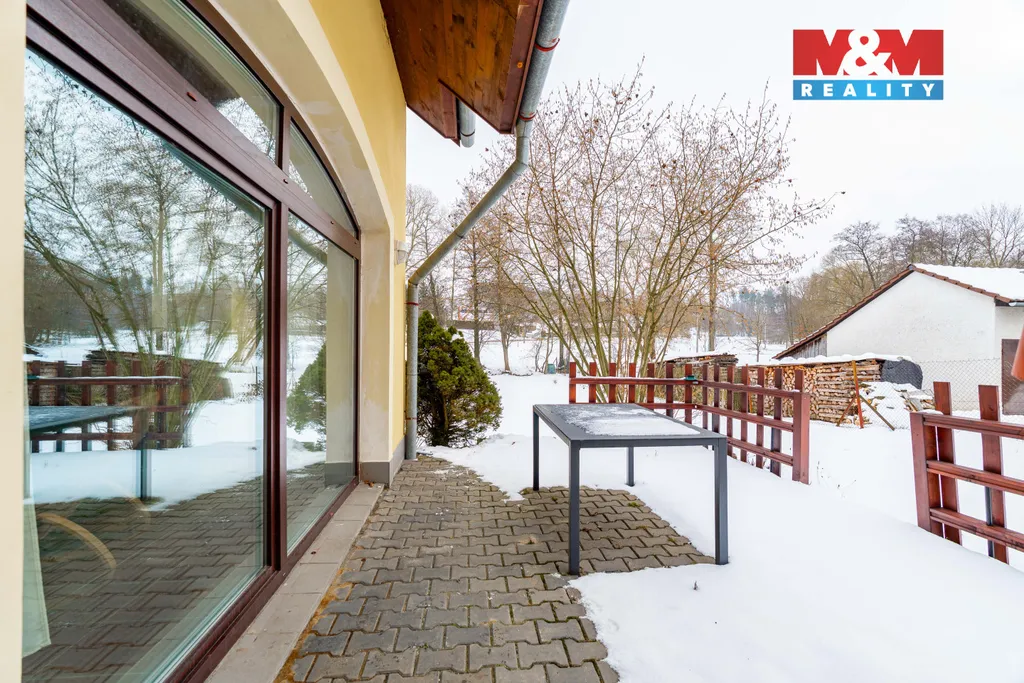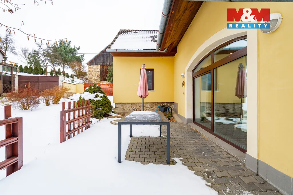 Velkým benefitem je terasa s jižní orientací, přístupná z obývacího pokoje velkým francouzským oknem – ideální místo pro ranní kávu i letní posezení s rodinou. Na konci zahrady protéká potok s dostatkem vody, který dodává pozemku jedinečnou atmosféru. Praktickým prvkem je také samostatný přístup na zahradu bránou z ulice vedle domu.