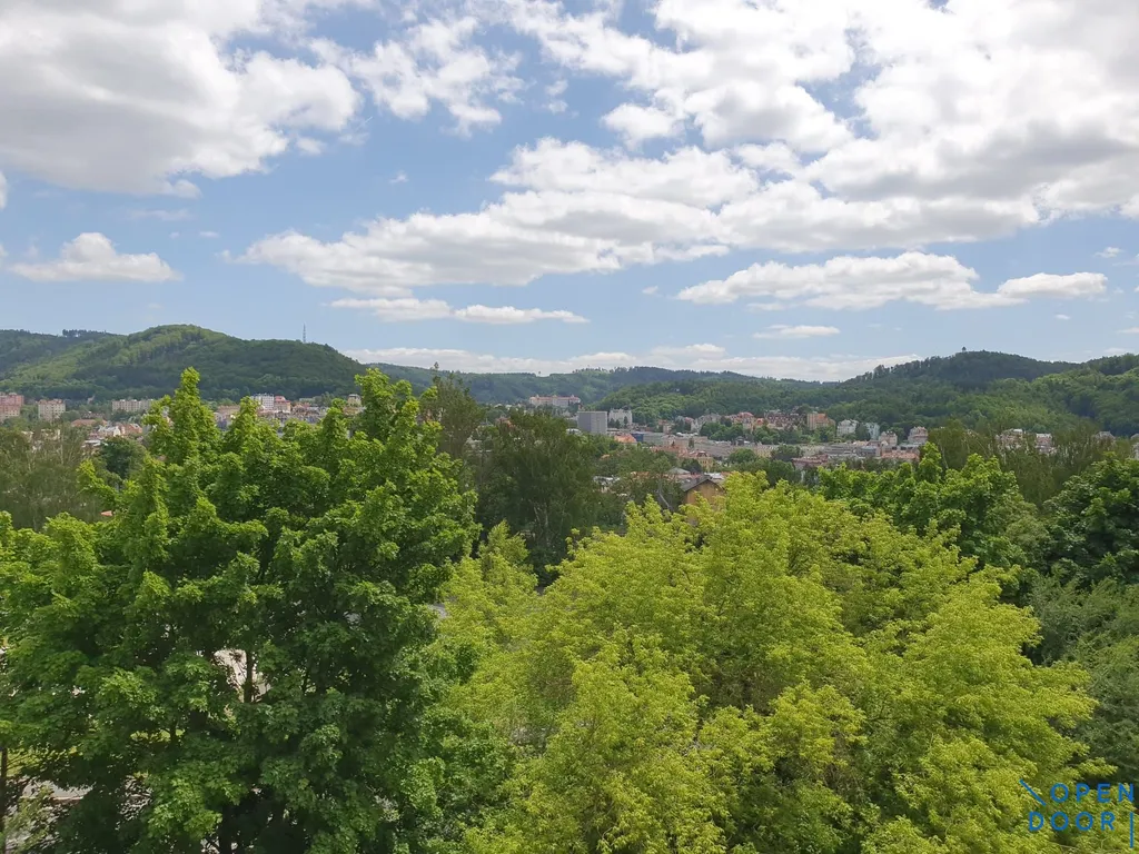 Byt je světlý a vzdušný se dvěma pokoji a praktickou dispozicí. Kuchyň je vybavena kuchyňskou linkou s dřezem a kombinovaným sporákem, u okna je jídelní kout s výhledem do zeleně. Obývací pokoj nabízí krásný výhled na jih na údolí Karlových Varů, z druhé strany je výhled do parku a směrem ke Krušným horám.