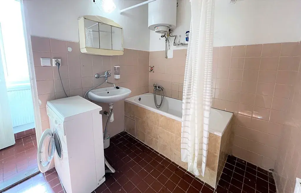 Z kuchyně se dále vstupuje na menší chodbu (cca 1,2 m²), ze které je přístup na samostatnou toaletu (cca 1,2 m²) a do koupelny o velikosti cca 5,5 m². V koupelně se nachází vana, umyvadlo, zrcadlová skříňka, koupelnová skříňka, pračka a bojler pro ohřev vody.