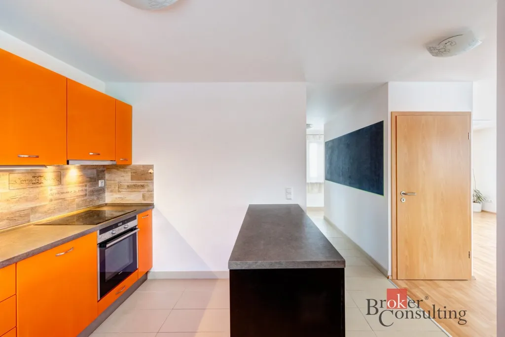 Po vstupu do domu se nachází předsíň, ze které se vstupuje do hlavního obytného prostoru. Ten tvoří velkorysý obývací pokoj propojený s kuchyní, která je laděna do výrazné oranžové barvy a dodává prostoru energii a moderní charakter. Obytný prostor působí velmi otevřeně a je ideálním místem pro každodenní rodinný život i setkávání s přáteli.