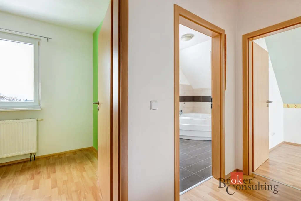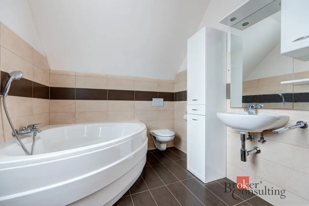 Po schodišti se dostanete do 1. patra, kde je klidová část domu. Najdete zde tři samostatné ložnice, které mohou sloužit jako dětské pokoje, ložnice, pracovna nebo pokoj pro hosty. Dominantou patra je prostorná koupelna, která nabízí skutečný komfort – nachází se zde velká rohová vana i sprchový kout a díky velikosti působí velmi vzdušně a komfortně.